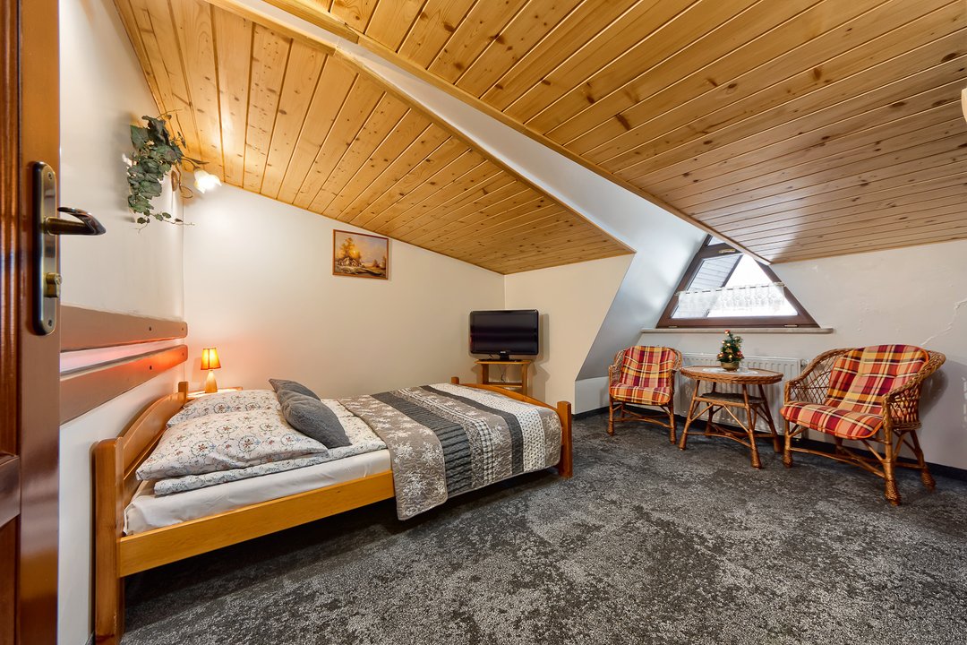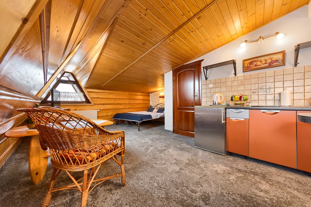Przyjazna kwatera. Sympatyczna właścicielka. Pokój czysty, łazienka również. Wygodny materac. Aneks na pół piętrze, na dole w części wspólnej bilard, tenis, TV. Jedyny minus to malutka kuchnia w części wspólnej. Przy większym obłożeniu na pewno by był problem żeby przygotować posiłek. My byliśmy grupą 6 osobową i ledwo się mieścilismy. ~ Ewelina P